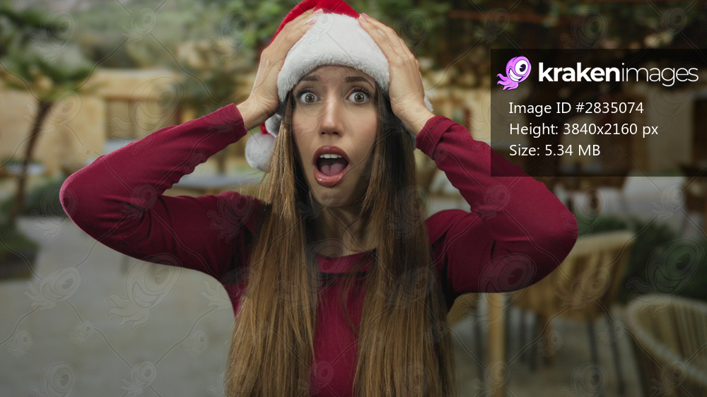 Woman holds festive red santa hat with both hands atop her head on a sunlit terrace with blurred tables behind; surprise.