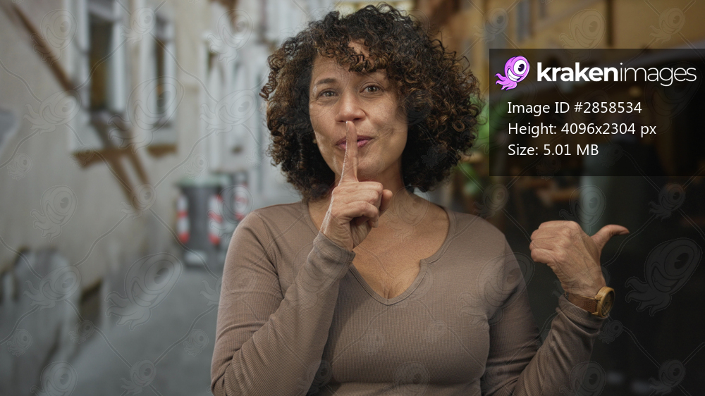 Woman holds finger to lips for silence on a narrow urban street lined with buildings and cafe seating; silence secrecy.