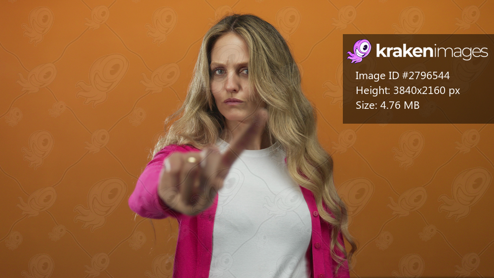 Woman holds finger to show refusal while facing a wall, depicting a young blonde subject on an orange background isolated over the empty frame.