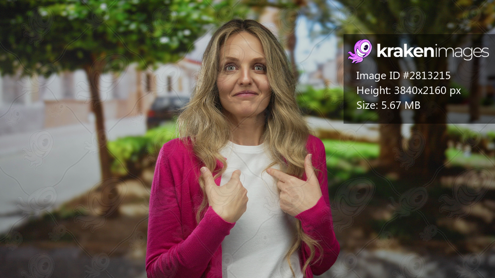 Woman holds finger while pointing towards herself in park where young blonde stands amid green outdoors with surprised expression.
