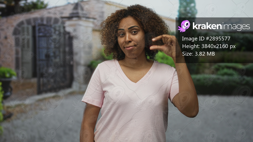 Woman holds fingers close in a small pinch gesture in front of a green building; playful measurement comparison.
