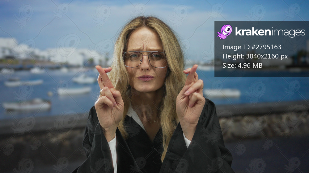 Woman holds fingers crossing by seaside as young blonde judge in uniform stands at port outdoors hoping for good luck.