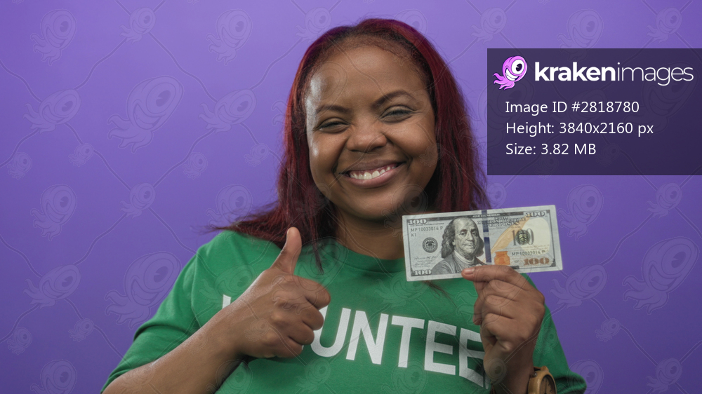 Woman holds folded one hundred dollar bill and gives thumbs up in purple studio; satisfaction generosity.