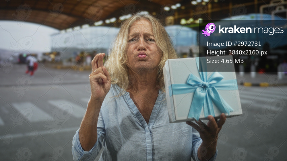 Woman holds gift box with blue ribbon, fingers crossed and puckering lips at airport terminal curbside; hopeful anticipation.