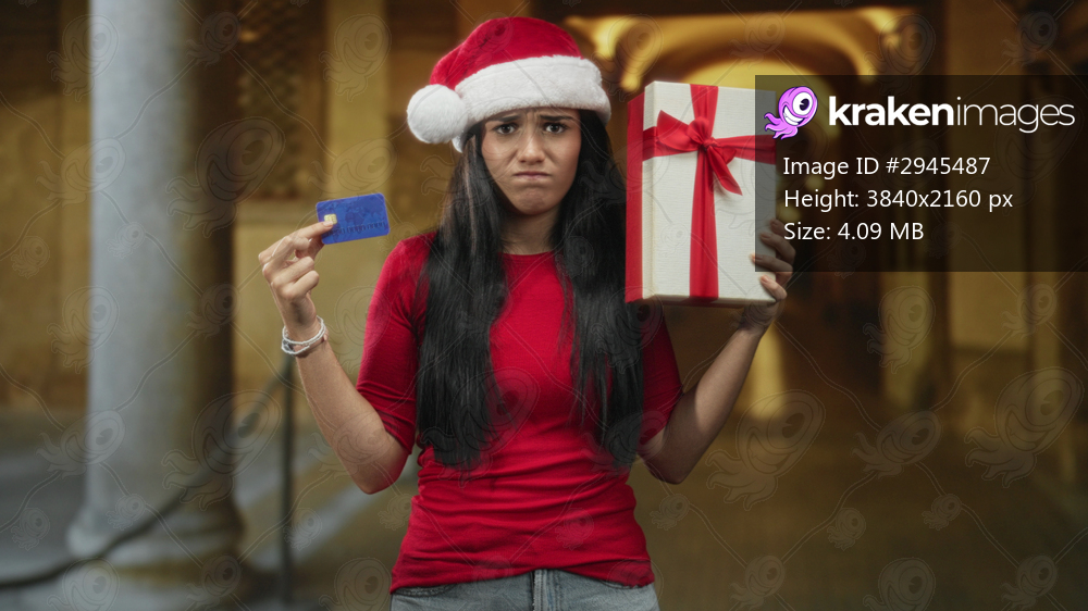 Woman holds giftbox and shows creditcard with hand gesture and santa hat in ornate building corridor; holiday concern.