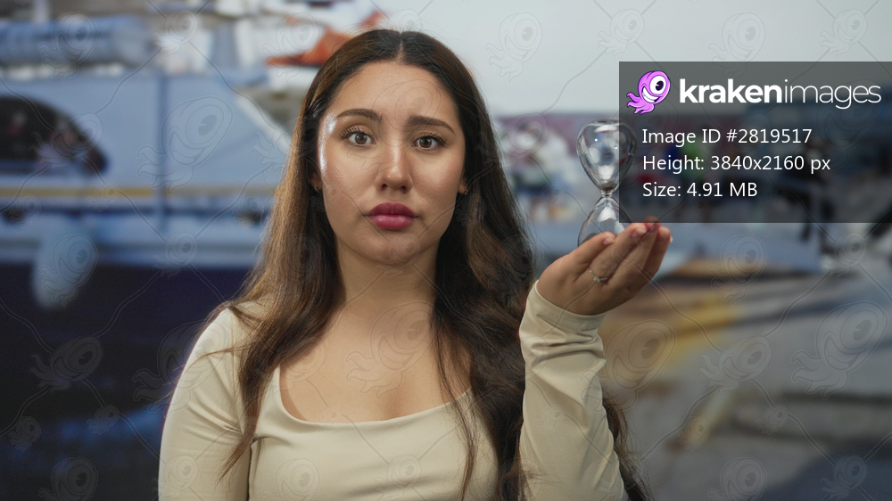 Woman holds glass hourglass filled with sand with outstretched hand and focused gaze at sunlit port; patience.