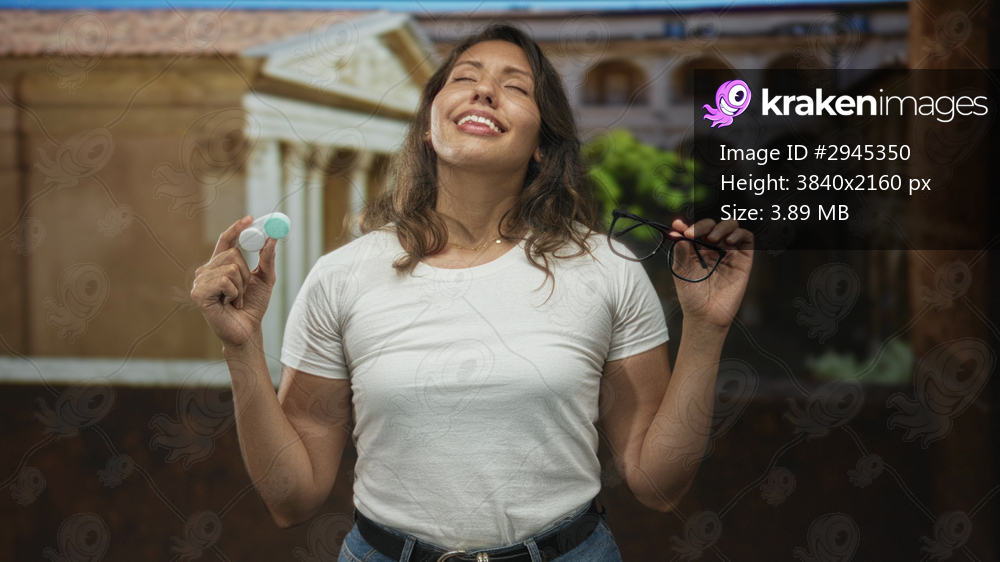 Woman holds glasses and contact lens case at chest level in old town building courtyard, eyes closed and smiling with relaxed posture; relief ease.