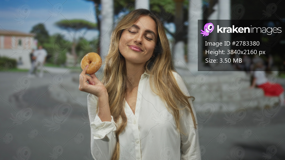 Woman holds glazed donut near cheek in historic plaza wearing white shirt; joy indulgence contentment.