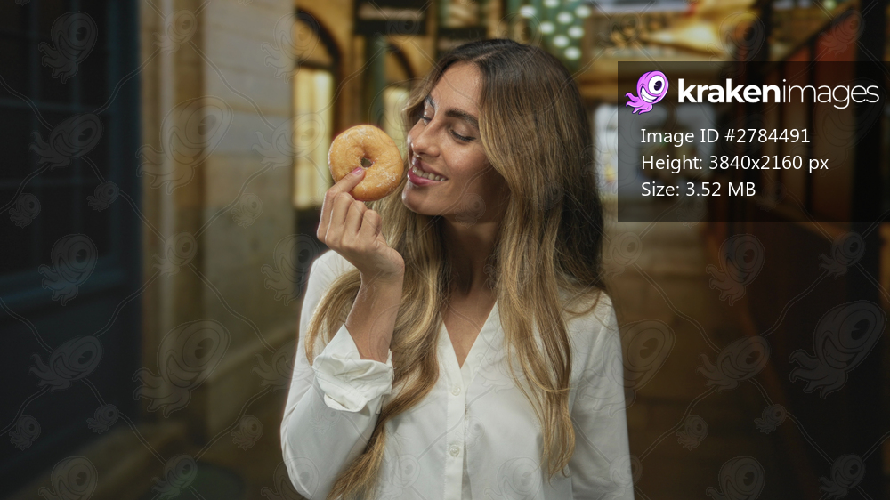 Woman holds glazed donut near smiling face beneath decorative lights in shopping arcade; fun enjoyment indulgence.