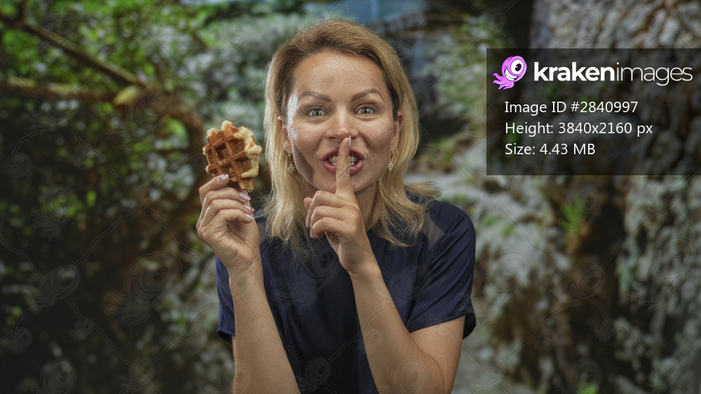 Woman holds golden waffle beneath green forest canopy and finger to lips for silence; quiet craving secret treat.