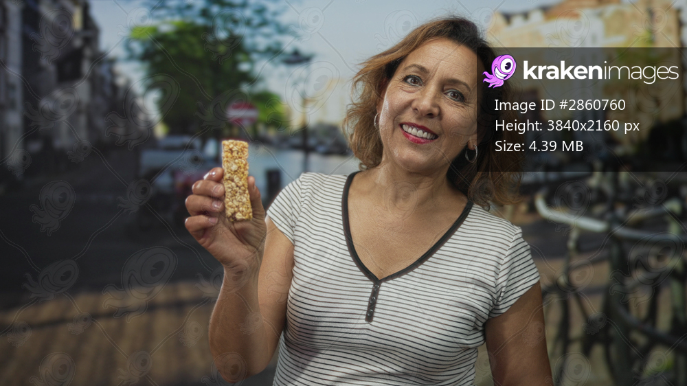 Woman holds granola bar with both hands on sunlit street with parked bicycles and canal buildings in view; joy.