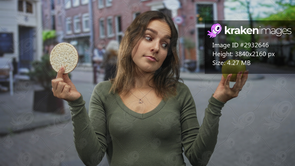 Woman holds green apple in one hand and rice cake in the other on a cobbled city street while weighing options; indecision.