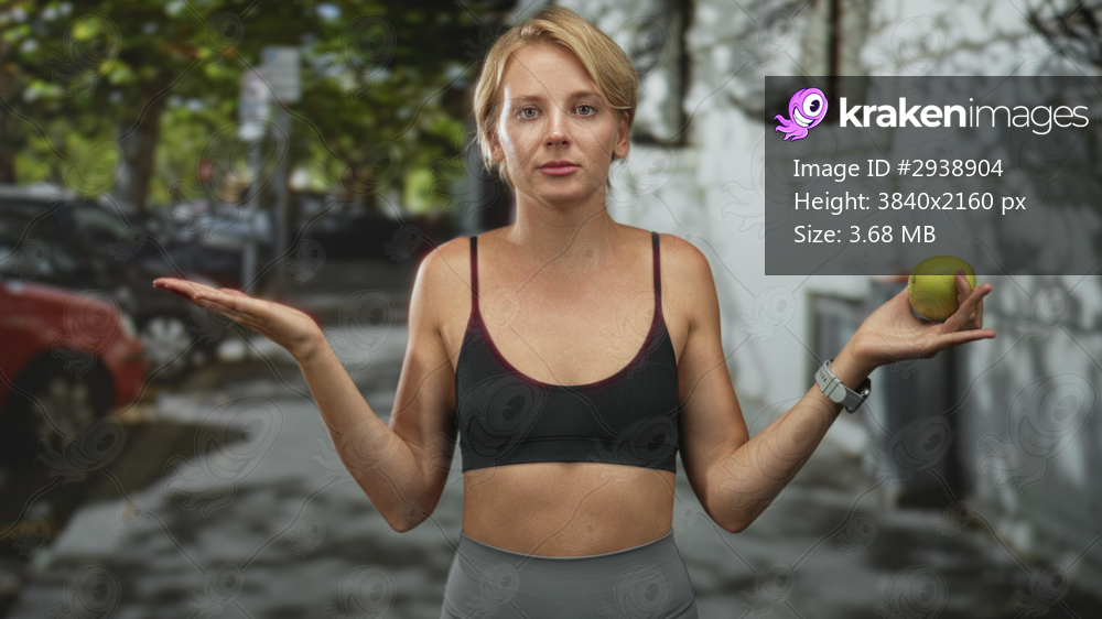 Woman holds green apple in raised hand with crossed forearms on street beside building and parked cars; defiance health choice.