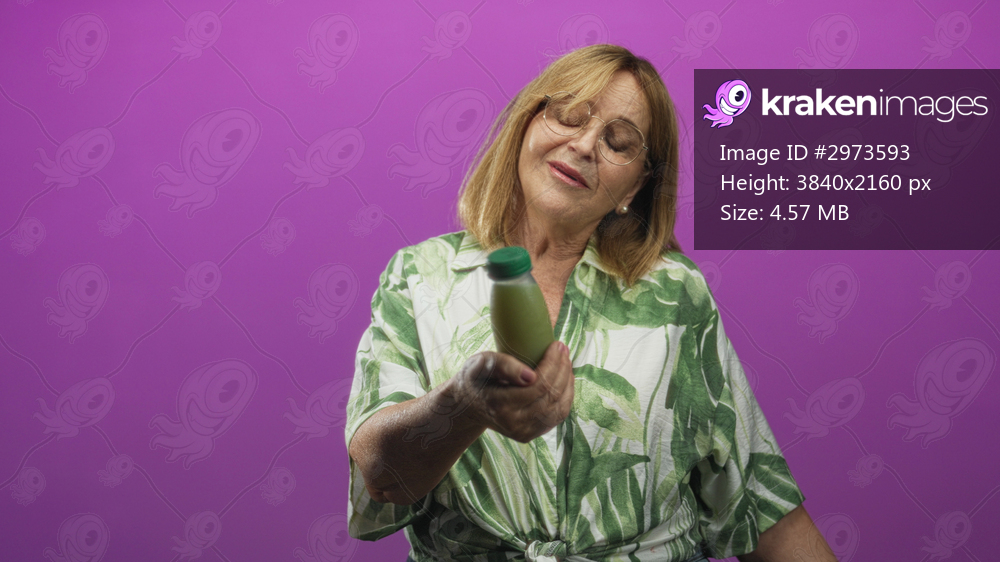 Woman holds green juice bottle in hand, offering then cradling it against a purple studio backdrop; contentment nourishment.