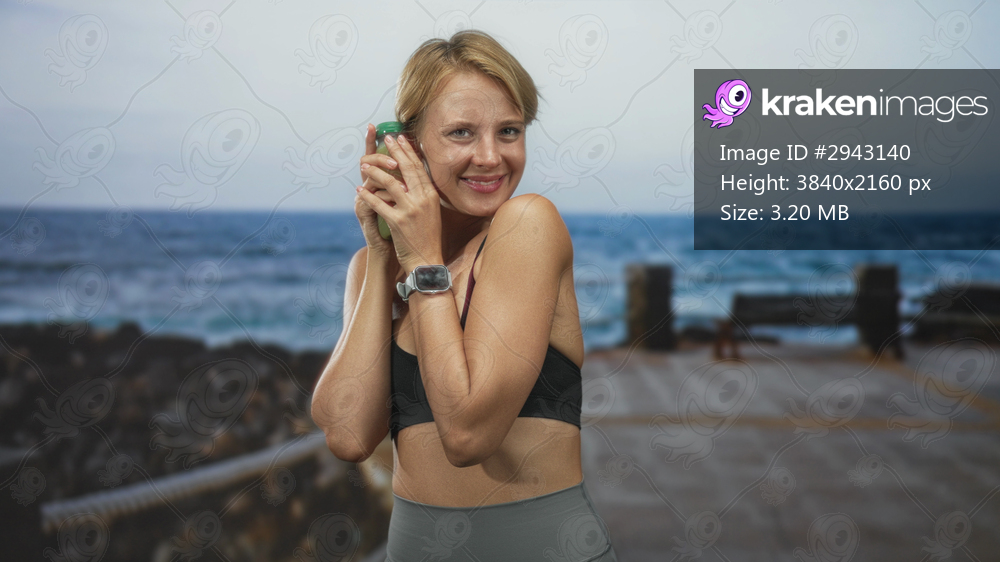 Woman holds green juice bottle to face on a wooden pier in sports bra showing bare midriff and smartwatch, smiling while inspecting drink; fitness wellness serenity. - Kraken Images