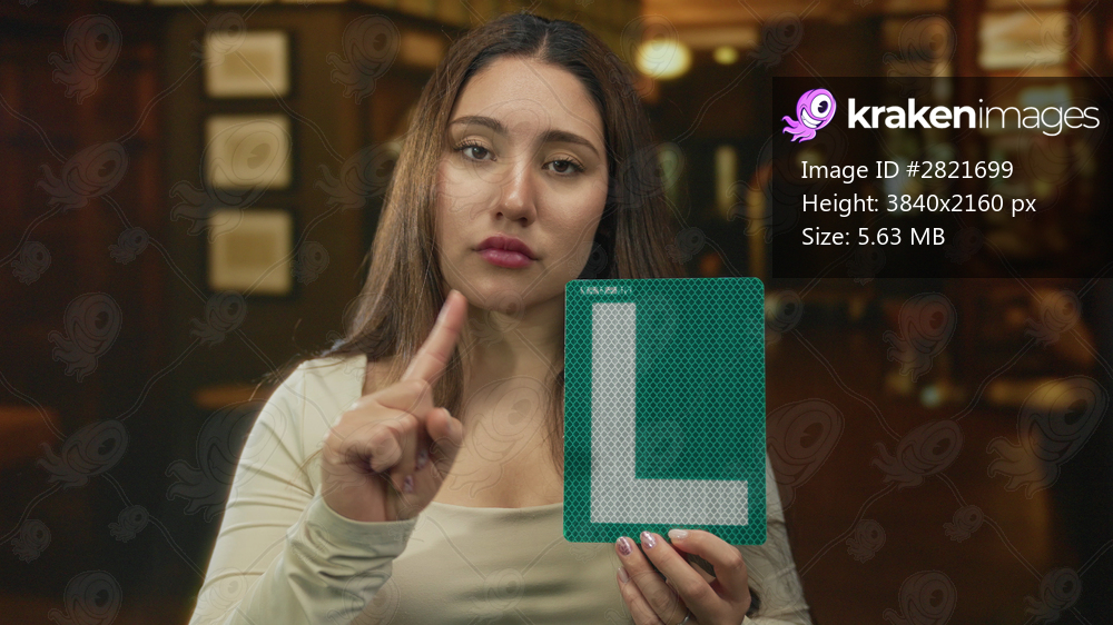 Woman holds green learner plate sign and points finger in hotel building lobby; learning uncertainty.