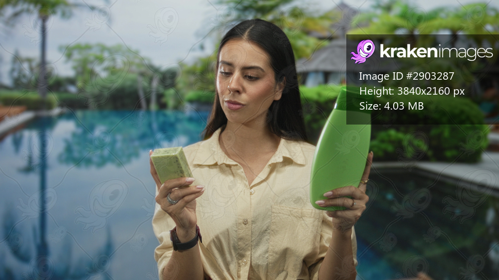 Woman holds green shampoo bottle and soap at resort poolside with hands raised and product facing front, natural expression; skin care relaxation.