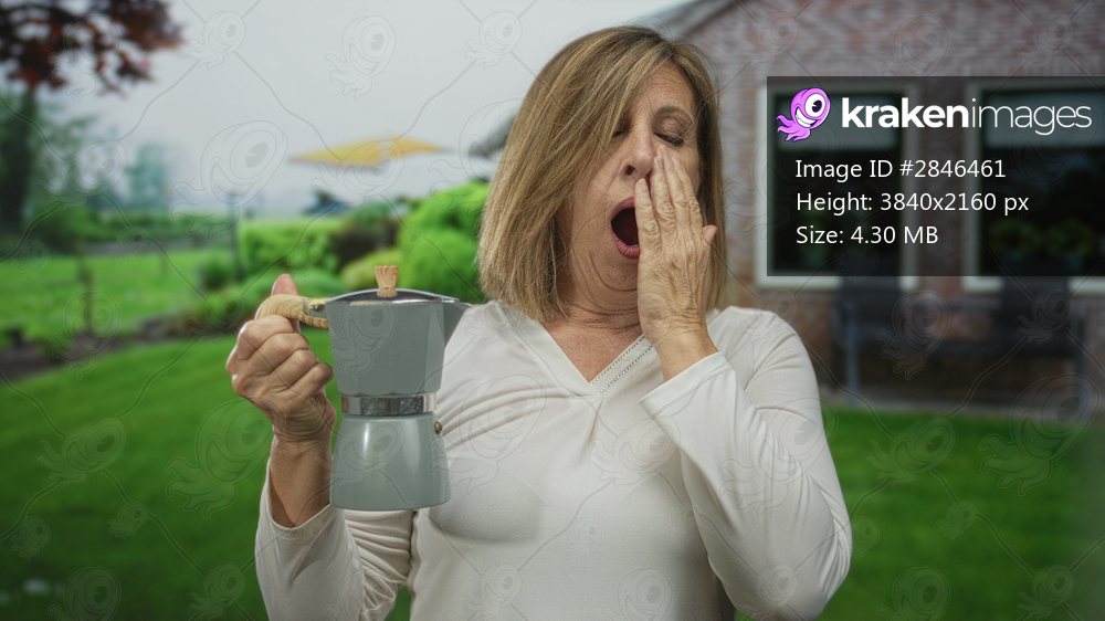 Woman holds grey coffee maker and covers mouth with hand for yawn outside a building; morning tiredness.