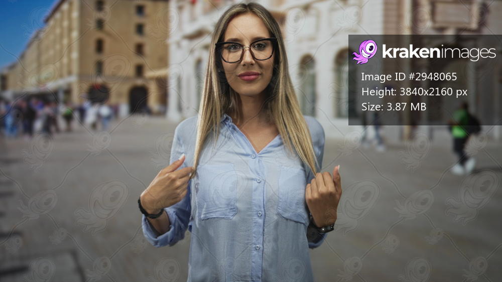 Woman holds hair with both hands on a street in front of a historic building, wearing glasses and light blue shirt; confidence self care.