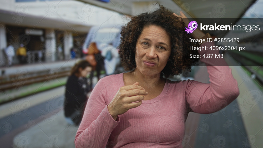 Woman holds hair inside building terminal near railway tracks with subtle frown and waiting posture; impatience.