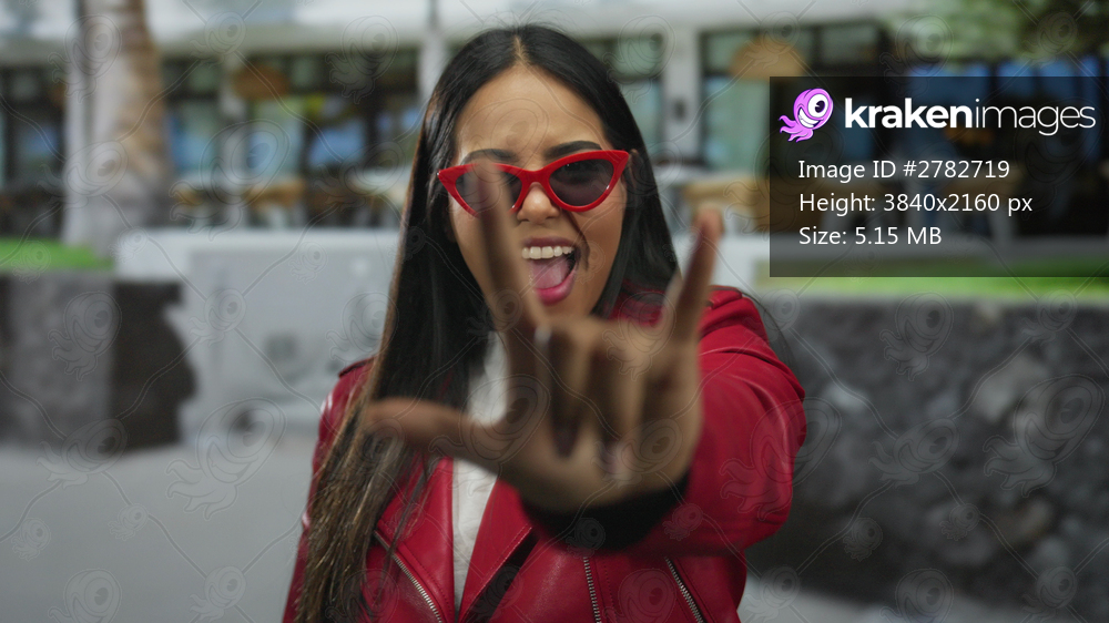 Woman holds hand in a rock sign on a street with a young latin hispanic vibe captured outdoors with a gesture and a smiling face.