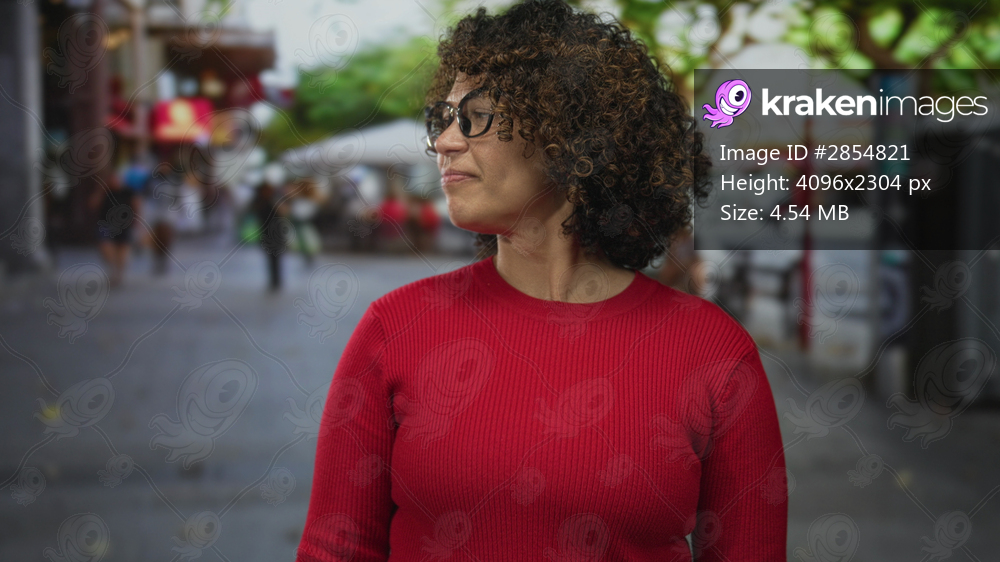 Woman holds hand in thumbs up gesture while wearing red sweater on a busy urban street; approval positivity.