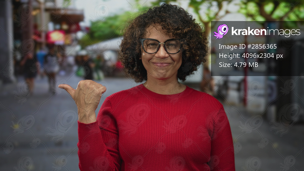 Woman holds hand in thumbs up gesture while wearing red sweater on a busy urban street; approval positivity.
