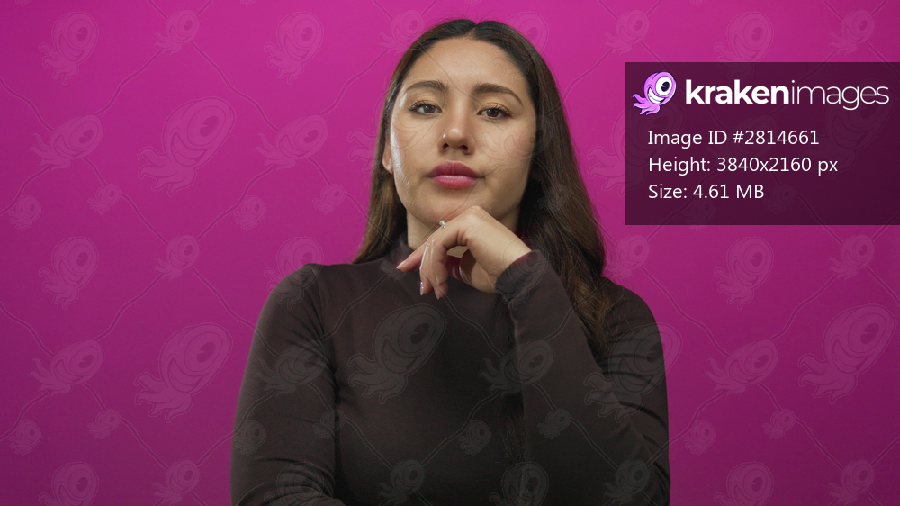 Woman holds hand on chin with direct gaze at camera for thinking in studio against pink wall; introspection.