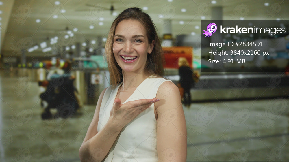 Woman holds hand palm up presenting empty baggage claim carousel at airport terminal; travel excitement.