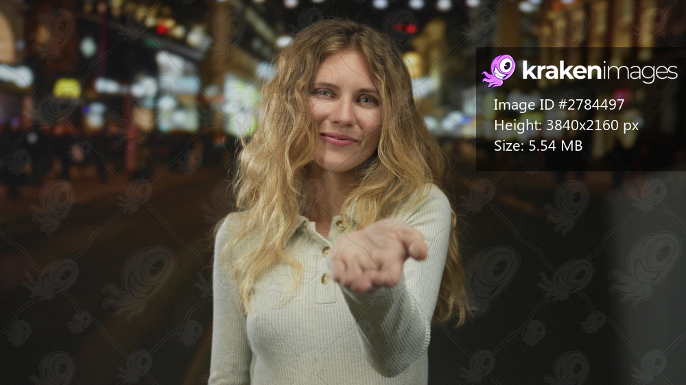 Woman holds hand reaching across a street, showcasing blonde hair and young features while smiling under city night urban lights.