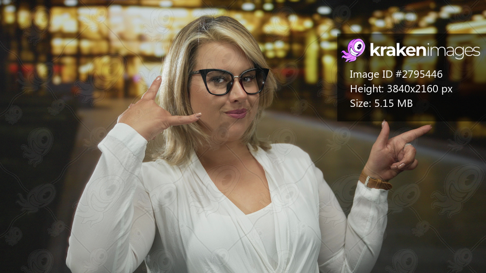 Woman holds hand shaped like phone to ear and points finger on a busy street at night with blurred city lights; communication connection playful.
