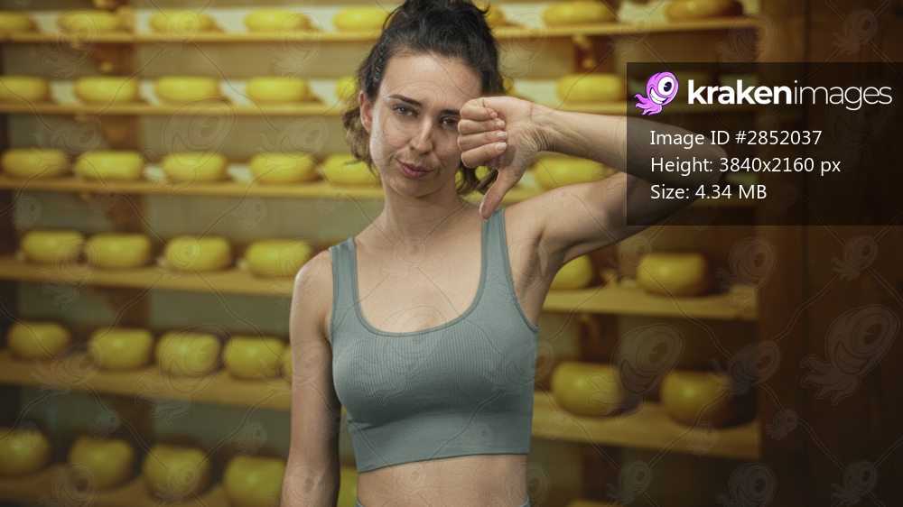 Woman holds hand with thumb down toward cheese wheels on shelves inside a shop building; critical disappointment.