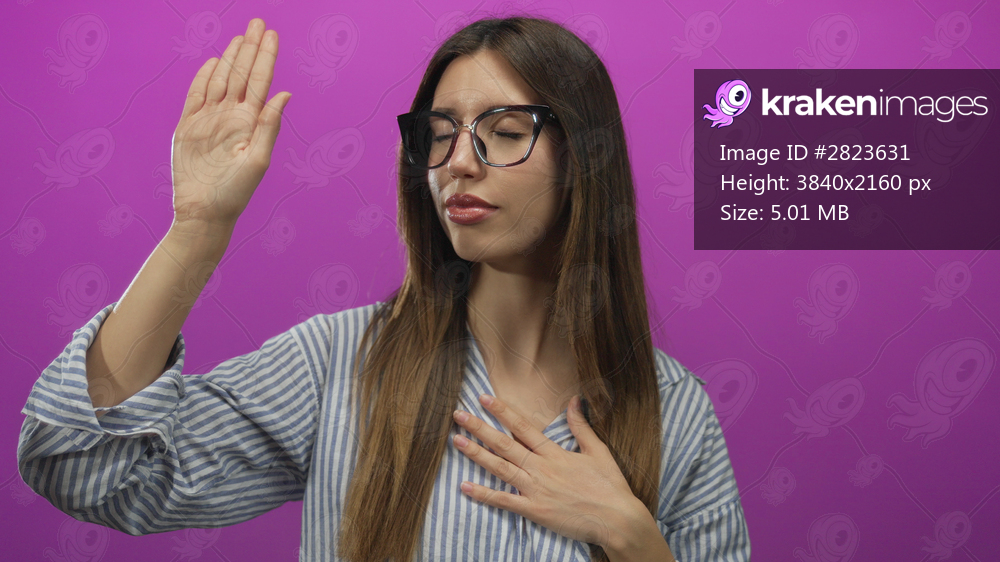 Woman holds hand to chest and raises palm against vibrant magenta studio backdrop with closed eyes and calm expression; devotion.