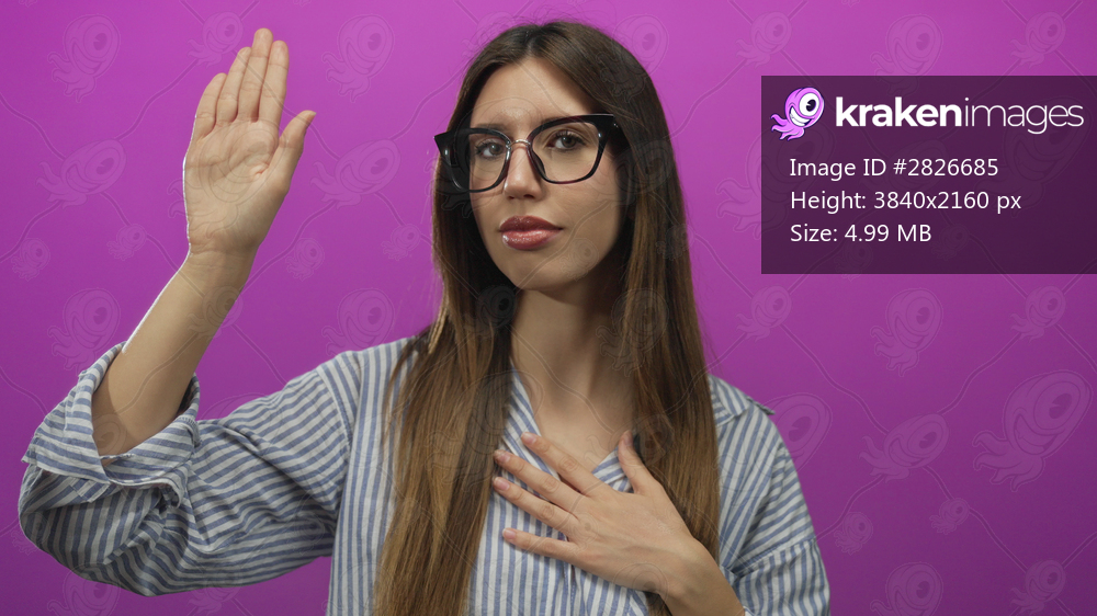 Woman holds hand to chest and raises palm against vibrant magenta studio backdrop with closed eyes and calm expression; devotion.