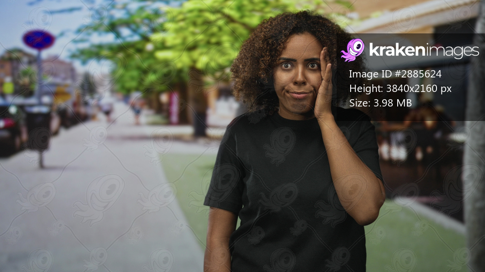Woman holds hand to forehead on city street shading eyes and touching temple with worried expression; urban stress.