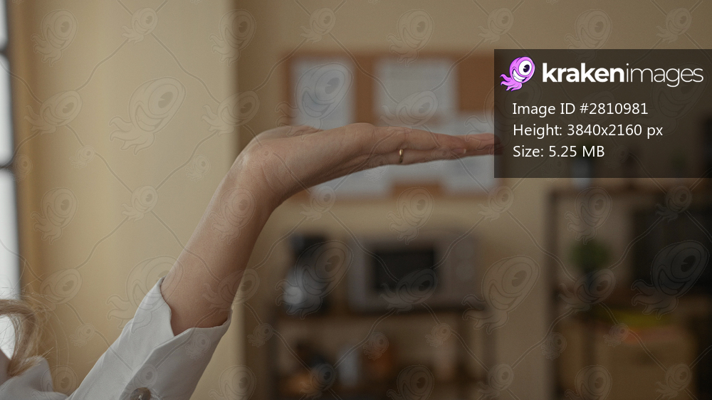 Woman holds hand up presenting content in office context for a young blonde team member working in an indoor workplace room interior setup.