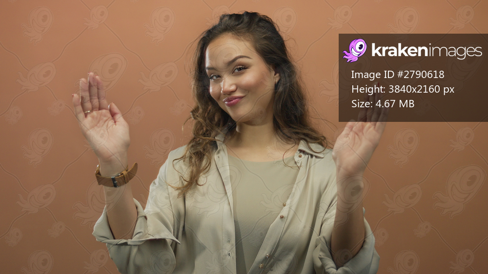 Woman holds hands apart with palms facing camera against brown wall in studio; confidence playfulness.