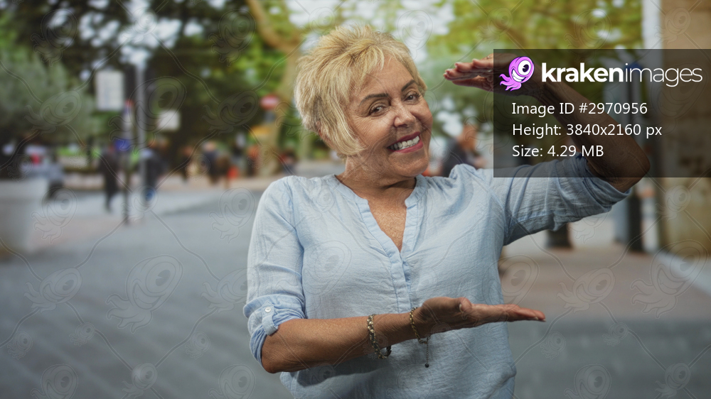 Woman holds hands apart presenting an invisible object on a street with trees and blurred pedestrians; joy confidence warmth.