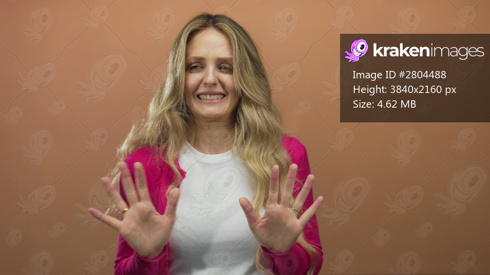 Woman holds hands away in disgust against background featuring young blonde over isolated brown wall.