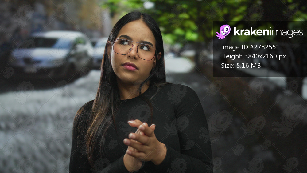 Woman holds hands before clapping softly on street while young latin hispanic subject stays outdoors looking bored behind glasses.