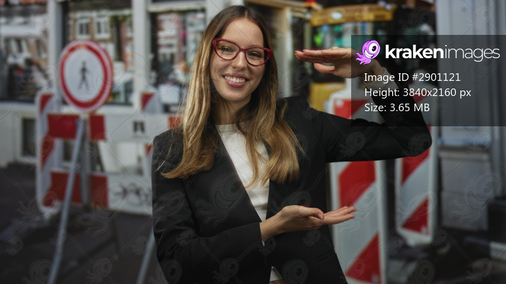Woman holds hands framing a space with palms visible while smiling, wearing red glasses and blazer on street near construction barriers; confidence presentation. - Kraken Images