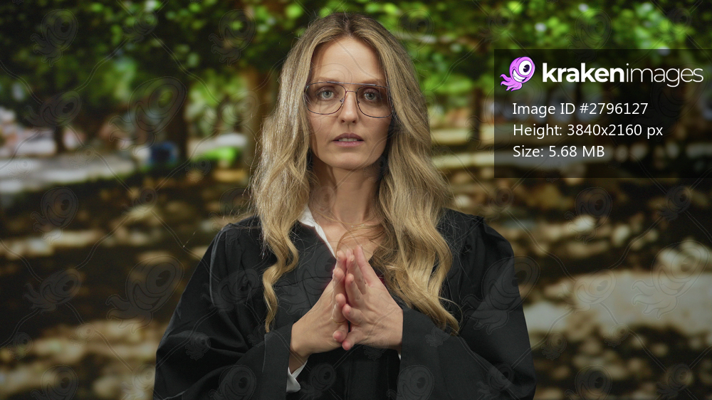 Woman holds hands gesturing in park near young blonde judge wearing uniform outdoors with green foliage background.