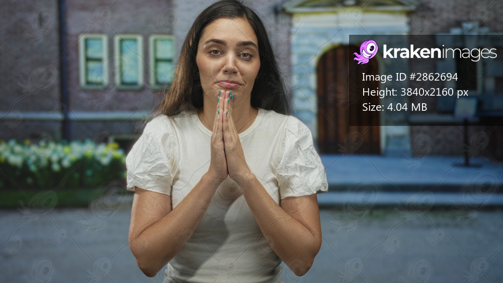 Woman holds hands in prayer gesture at building entrance outdoors with pleading expression; seeking forgiveness.