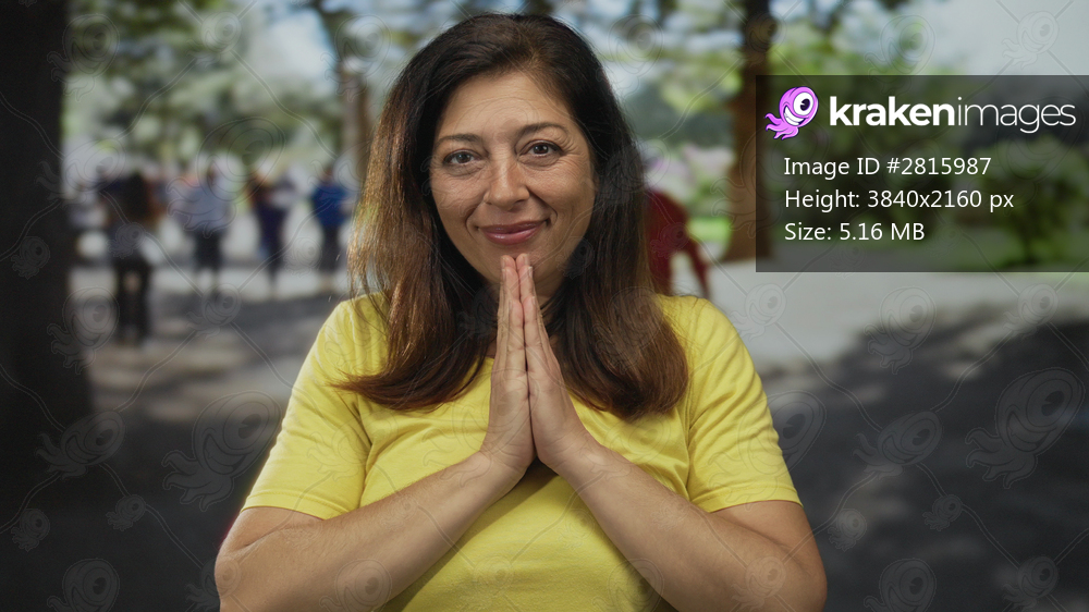 Woman holds hands pressed together and closes eyes in prayer gesture at green park outdoors; serenity reflection.