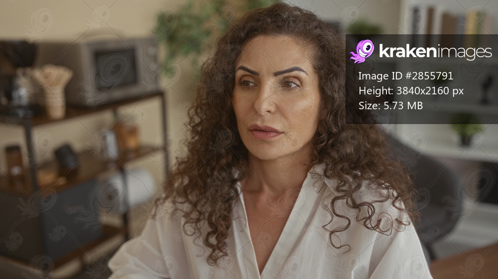 Woman holds head with both hands at desk in building office, her curly hair framing a furrowed brow; stress.