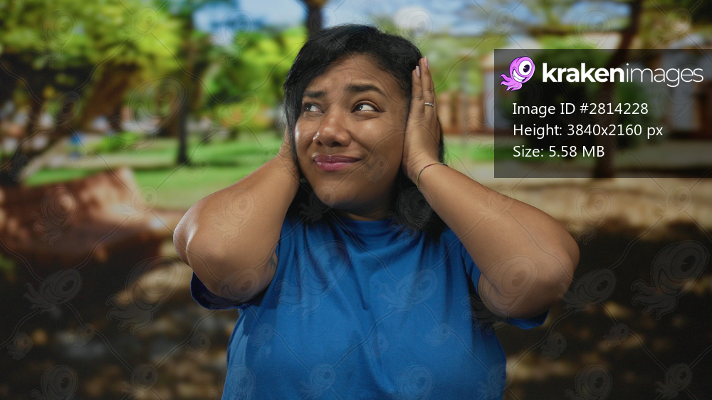 Woman holds head with both hands wearing blue shirt in sunny park with trees and a blurred building background; stress.
