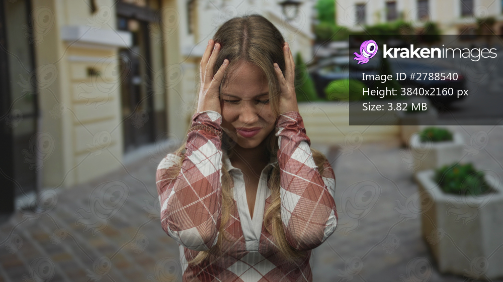 Woman holds head in her hands on a city street outdoors as she grimaces in discomfort; frustration stress.