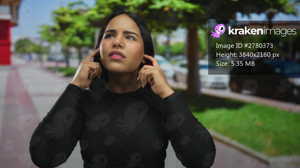 Woman holds her ears while covering at a busy street outdoors, the young latin hispanic individual suffers loud noise and appears annoyed.