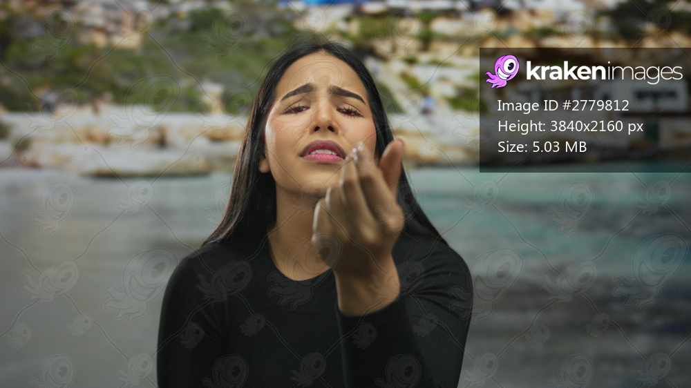 Woman holds her hands and starts begging at the beach with latin hispanic flair as a young figure by the seaside outdoors pleading for help.