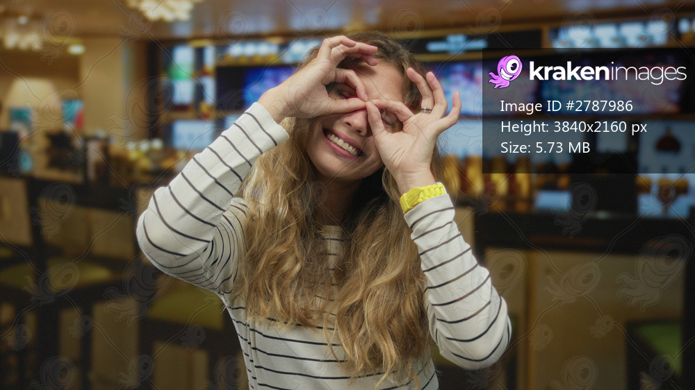 Woman holds her hands while smiling inside a cafe where a blonde young guest makes a playful binocular gesture looking very happy.